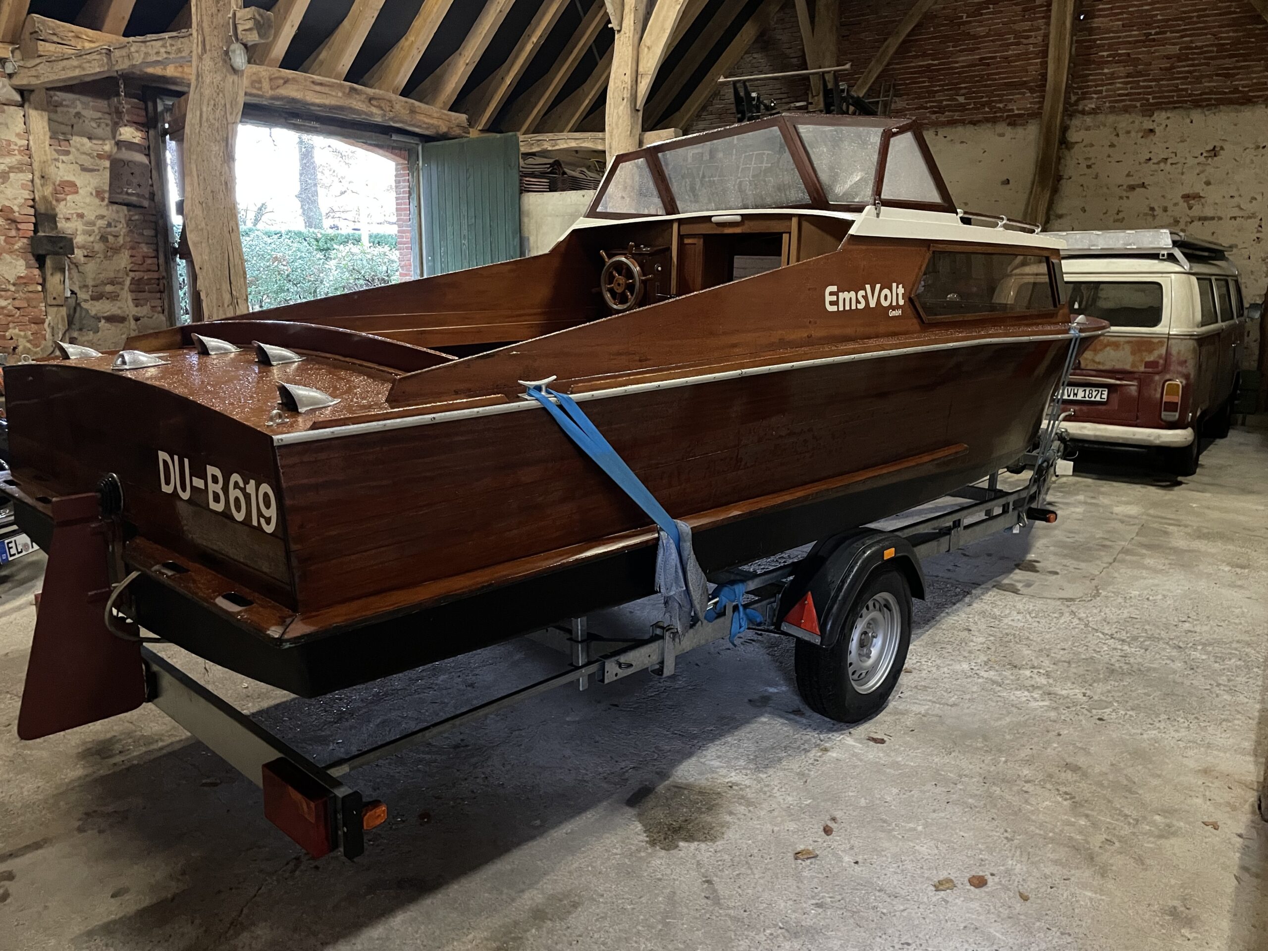 Dieses klassische Holzboot gleitet jetzt lautlos über das Wasser – mit einem EmsVolt Elektroantrieb.