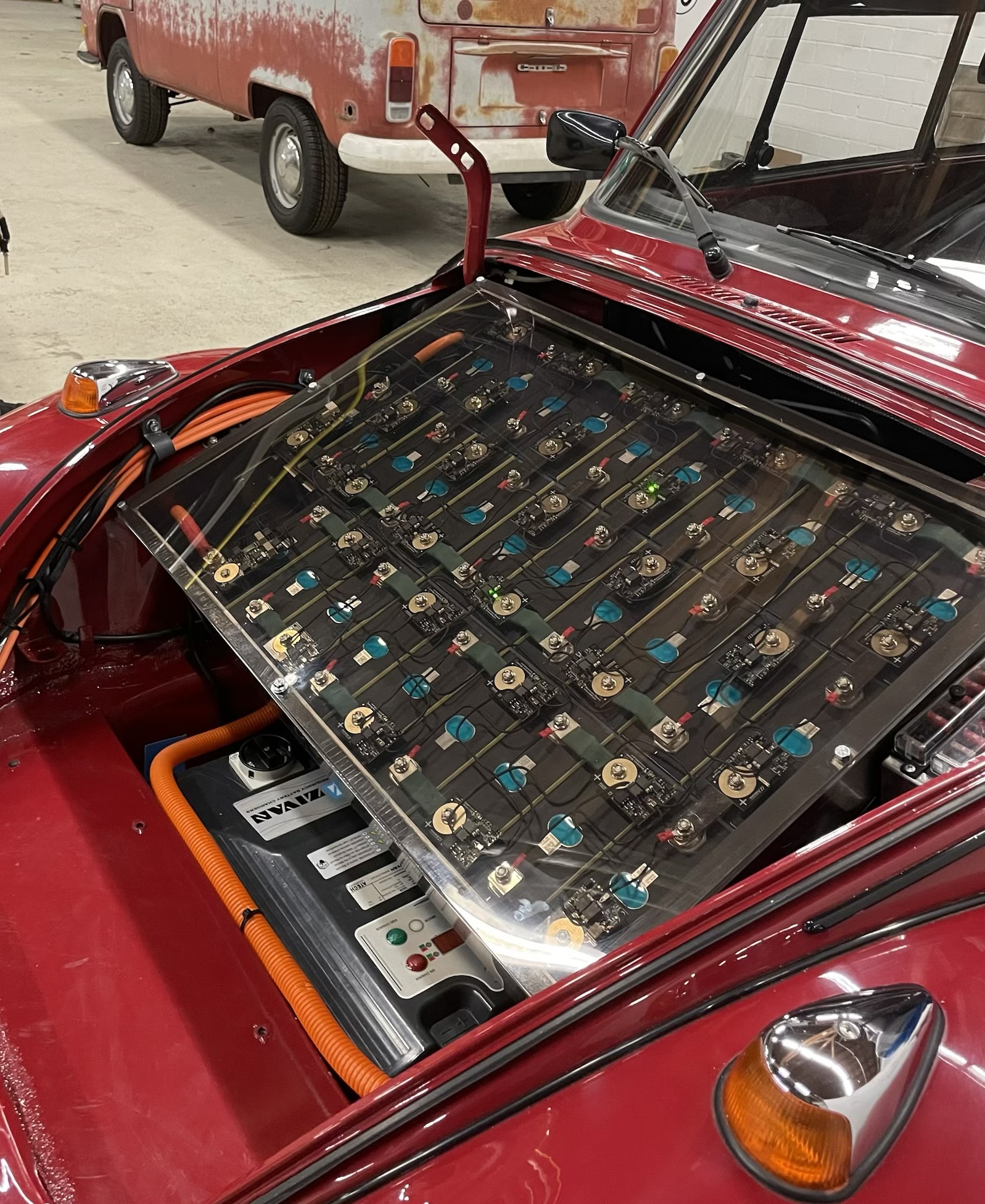 Inzwischen hat Max rund zehn Fahrzeuge erfolgreich elektrifiziert. Sein Signature-Projekt 2025, der Solarbulli, zeigt, was möglich ist: 500 km Reichweite, 92 kWh Batterie und autarkes Laden über Sonnensegel.